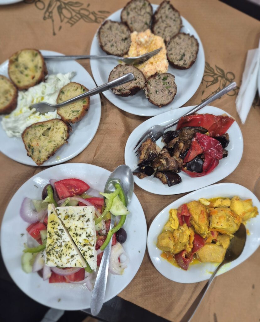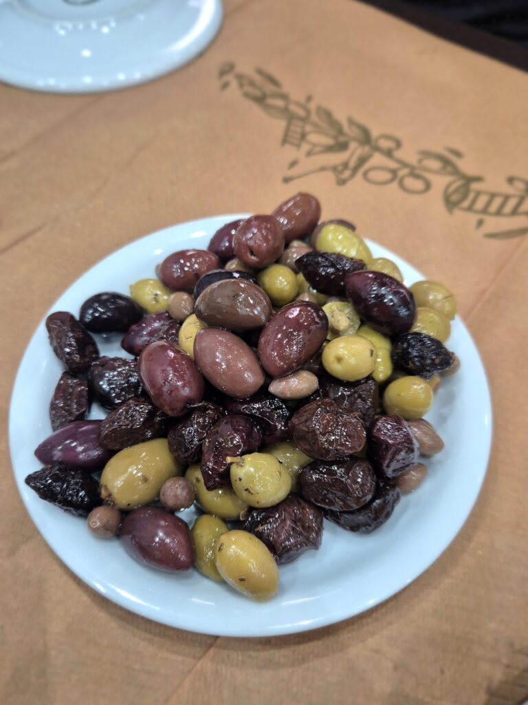 By now it was lunchtime, although we hadn’t stopped eating since the tour began! Before we sat down for our meal, Lolou guided us to an olive shop to pick up an assortment of olives to try. We also got a taste of their rather excellent Kalamata olive oil, and I ended up buying two bottles to bring back home. One of the things I loved about Greece was their mezze culture where they share a number of small plates (with drinks) in a convivial atmosphere with family and friends. Our lunch was a representation of this as multiple small plates kept coming from the kitchen — Greek salad, zucchini keftedes with tzatziki, meat keftedes, fava bean dip, saganaki (fried cheese), marinated anchovies, fried sardines, and so much more.