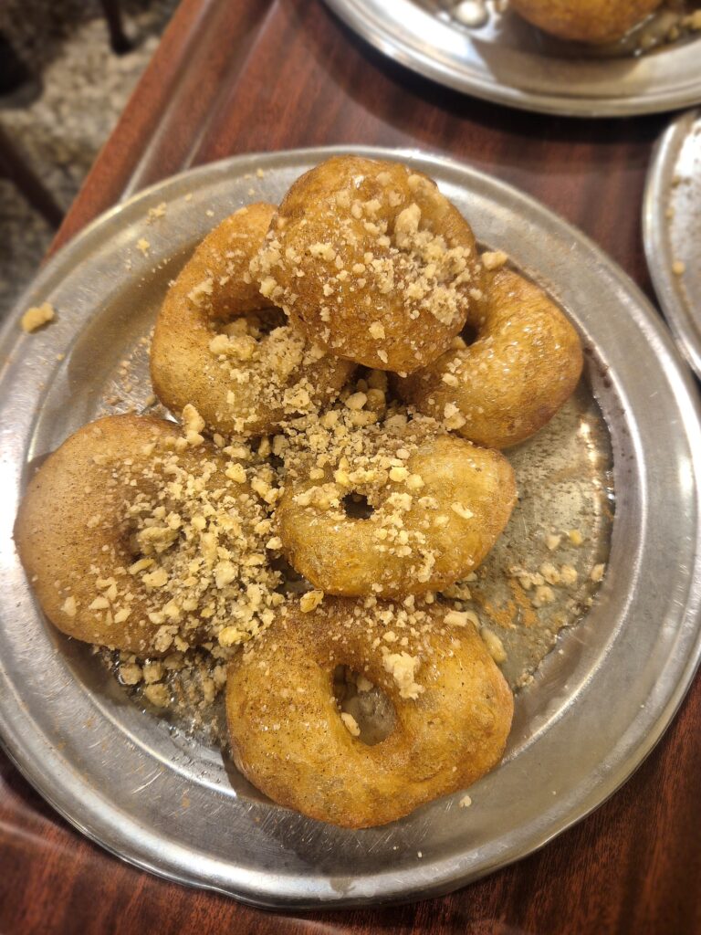 On an uncharacteristically grey and rainy morning in early October, I met my guide Katerina Lolou and a bunch of other food enthusiasts at the centrally located Monastiraki Square. The ticket instructions from Athens Walks Tour Company said “make sure you don’t eat anything at least 2 hours in advance”, so I had skipped breakfast and was quite hungry. But the tour began without further ado and we immediately hit our first stop — a bakery-cafe for an assortment of stuffed filo pastry pies like spanakopita (spinach and feta), kotopita (chicken), and savoury bougatsa (minced meat). The Greeks are masters of these flaky pies, particularly the sweet bougatsa filled with creamy semolina custard, which is a favourite breakfast of the Athenians (and me). Our next stop was for another sweet treat called loukoumades or fluffy Greek doughnuts that are deep fried to crispy golden and then drizzled with honey and crushed walnuts. The shop we visited is an Athenian institution that has been in the same family for three generations since 1923. We also tried their chocolate version of loukoumades (slathered with a Nutella-like spread), but I preferred the OG one.