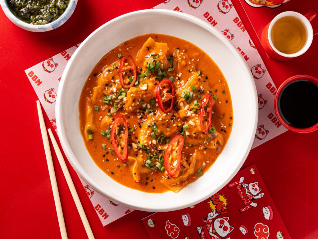 The star of the menu is the Ma La Dry Noodles, a Sichuan street-food staple from Chengdu and Chongqing. “Ma La” translates to “numbing and spicy,” a flavour born from the combination of Sichuan peppercorns and chilies. At Bang Bang!, these noodles are pulled fresh to order, carrying a chewy bite that soaks up layers of sesame, chili oil, and spice. The result is fiery, balanced, and deeply satisfying.