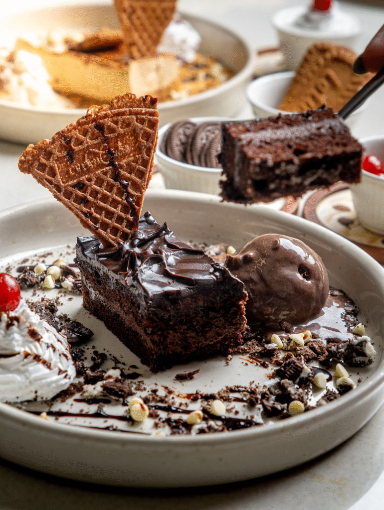 An indulgent treat for chocolate lovers, this rich Belgian truffle pastry comes paired with Chocolate To Die For ice cream, fudge sauce, Oreo crumble, whipped cream, white chocolate chips, and a crisp chocolate waffle.