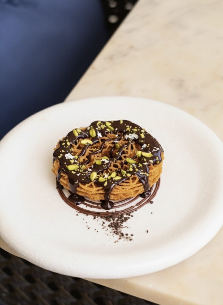 A celebration of tradition and modern elegance, the Crunchy Dark Chocolate and Hazelnut Dome pairs rich dark chocolate mousse with a crisp hazelnut praline base, finished in a glossy glaze. Alongside it, the Chocolate Ghewar reimagines Rajasthan’s iconic sweet with layers of decadent chocolate cream, blending heritage and indulgence in every bite.