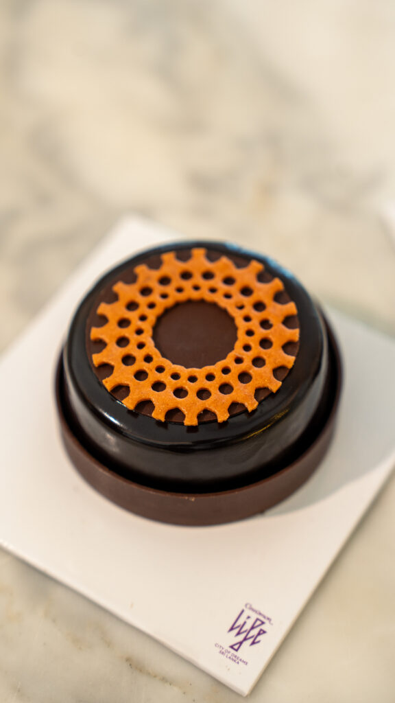 A rich, layered indulgence of milk chocolate ganache, silky mocha crème, crunchy hazelnut, and chocolate biscuit, this signature creation balances textures and flavors with nostalgic warmth. A contemporary twist on a timeless favorite, served at Sweet Lab on Level 24 of Cinnamon Life.