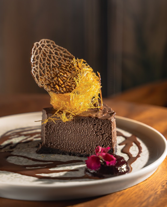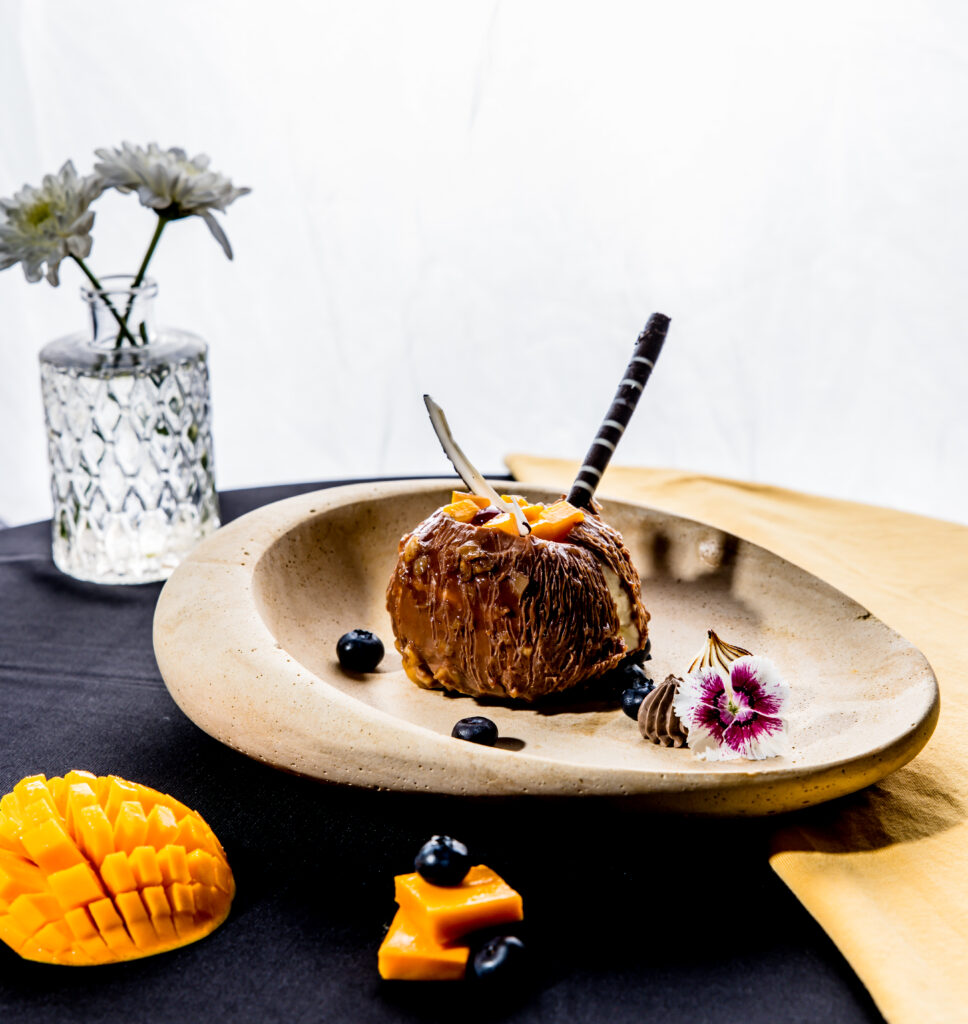 A tropical classic reimagined with indulgent flair, this dessert pairs silky dark chocolate mousse with rich coconut ganache, all encased in a hand-textured chocolate shell. Topped with fresh mango cubes, toasted coconut slivers, and a dark chocolate curl, it’s a nostalgic escape to sun-drenched holidays, one decadent spoonful at a time.
