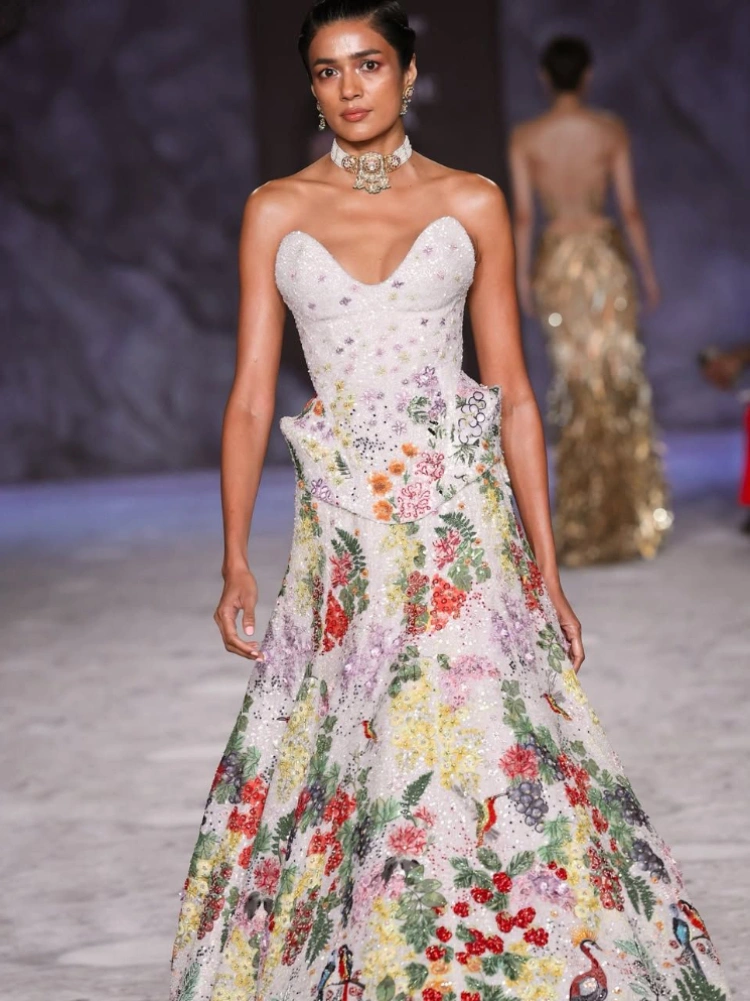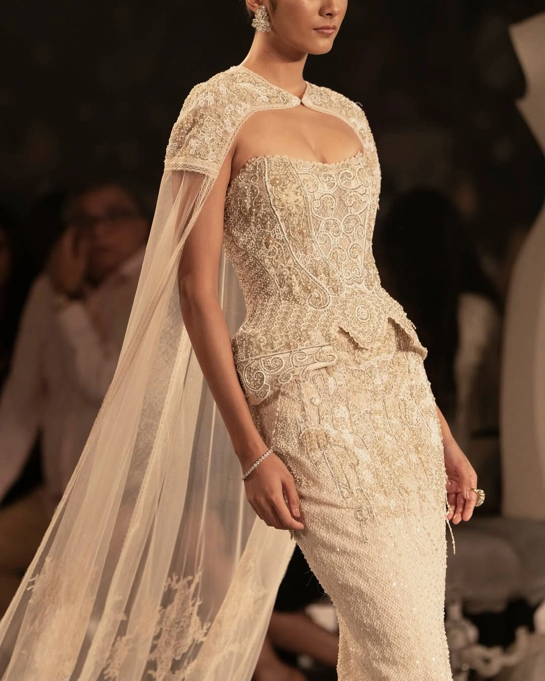 Rahul Mishra, revered for draped silhouettes and modern royalty, has taken a different approach. His corsets are softened through layered tulles, chiffon capes and pre-stitched dupattas that fall off the shoulders. The silhouette is glamorous but wearable—especially for a sangeet or engagement where movement and comfort are non-negotiable. Instead of the sharply cut Victorian torso, his corsets taper into the waist and dissolve into fluid skirts and separates.
