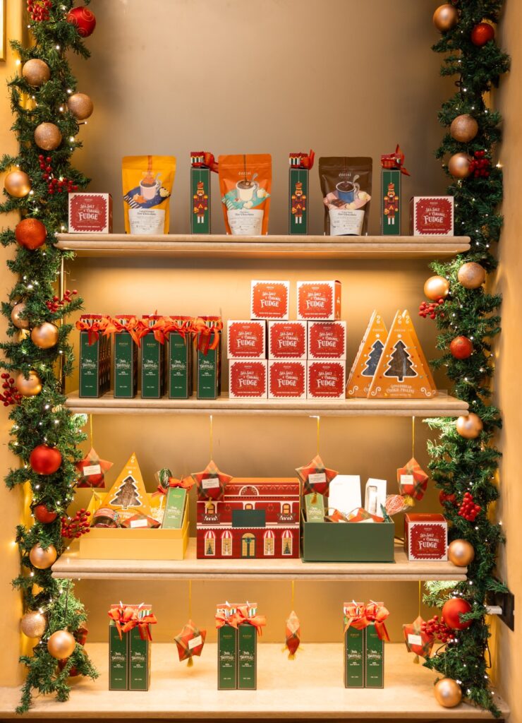 Ladurée brings Parisian magic to the season with its signature Vanilla Almond and Chocolate Hazelnut Yule Logs, crafted with almond biscuit, praline, salted caramel, and a macaron-finished shell. New festive additions include a fresh Strawberry Tart, a luxurious Fondant Pistachio Cake, and the indulgent Plaisir Sucré Croissant.