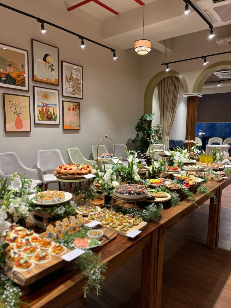 Malvika Mulchandani of Apero shared on Instagram that bite-sized appetisers like paprika hummus in cucumber canapes, kataifi lamb kebabs, chicken Caesar salad on parmesan shortbread, Asian noodle and veggie salad, cream cheese sushi rolls, assorted choux buns,