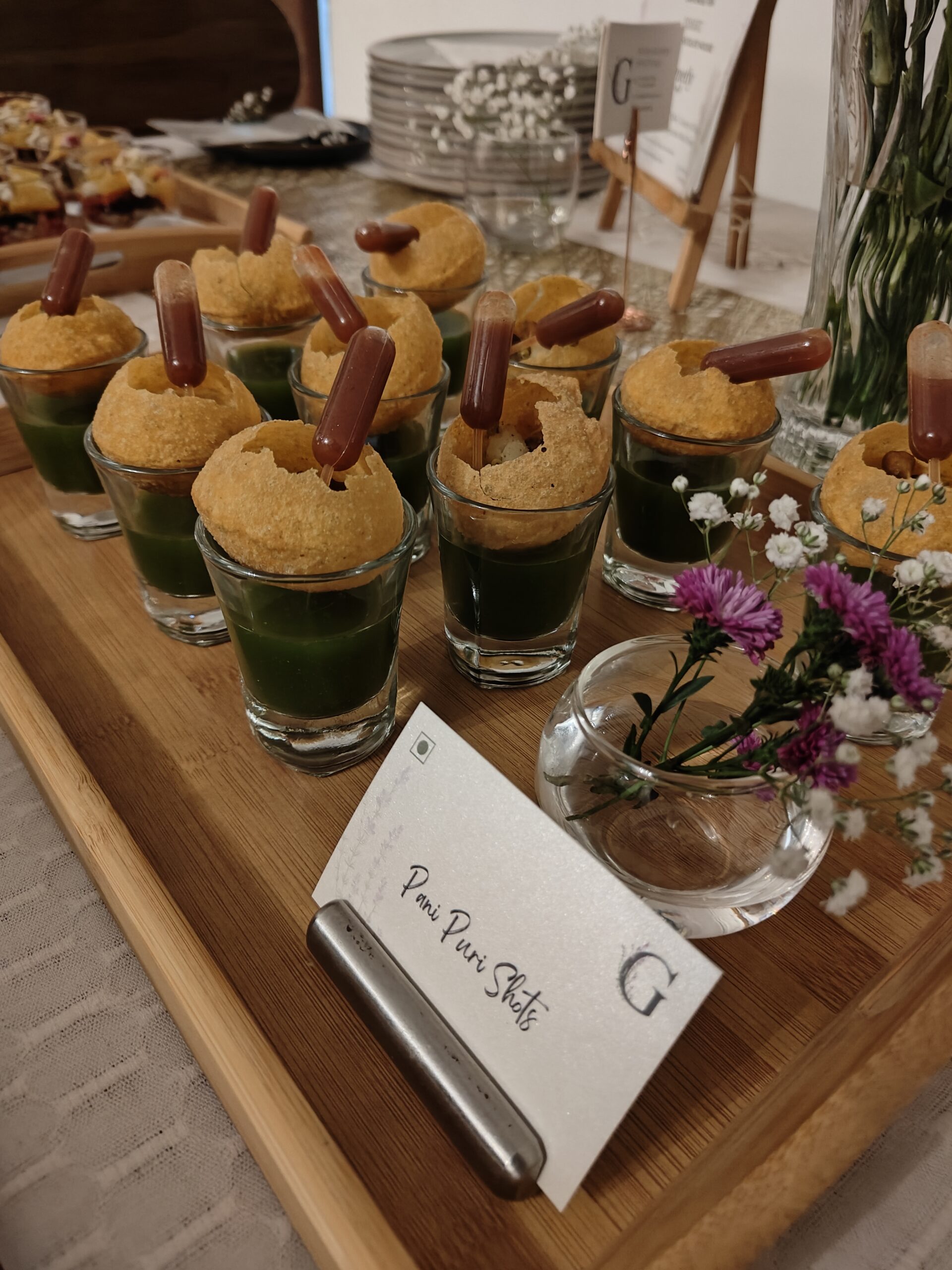 Malvika Mulchandani of Apero shared on Instagram that bite-sized appetisers like paprika hummus in cucumber canapes, kataifi lamb kebabs, chicken Caesar salad on parmesan shortbread, Asian noodle and veggie salad, cream cheese sushi rolls, assorted choux buns,