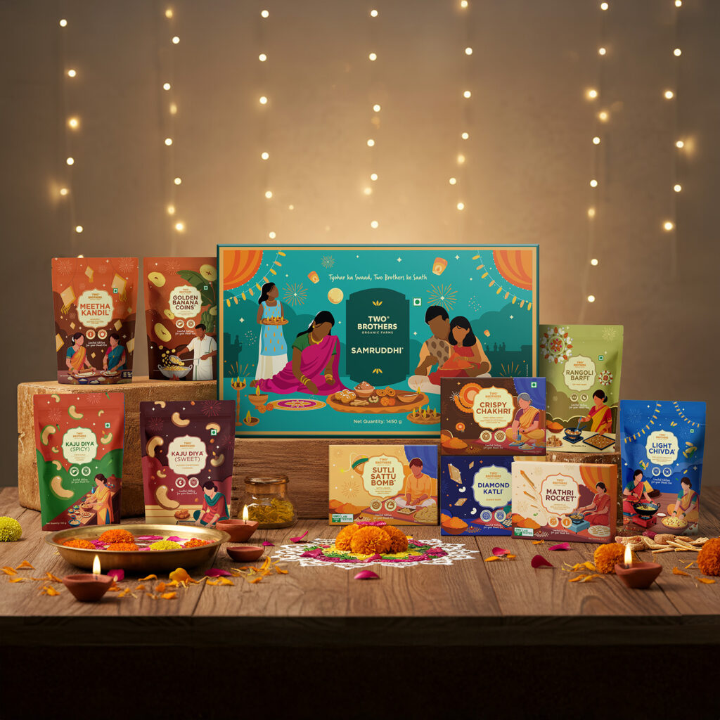 Two Brothers Organic Farms invites you to experience the joy of abundance with their Samruddhi Festive Abundance box, handcrafted in their farm kitchen using time-honoured recipes. From spicy Mirchi Cashews and golden Banana Chips to nut-rich Dryfruit Barfi and melt-in-the-mouth Kaju Katli made with cashews and jaggery, every treat carries the richness of tradition and the warmth of togetherness. The Samruddhi box also features Mathri Rocket, Crispy Chakli, Light Chivda, Sutli Sattu Bomb, Meetha Kandil, Rangoli Barfi, and both Green Chilli and Caramel Kaju Diyas, making it the perfect festive gift. Priced at 2,450/-, this hamper embodies prosperity, joy, and the happiness of sharing festive abundance.