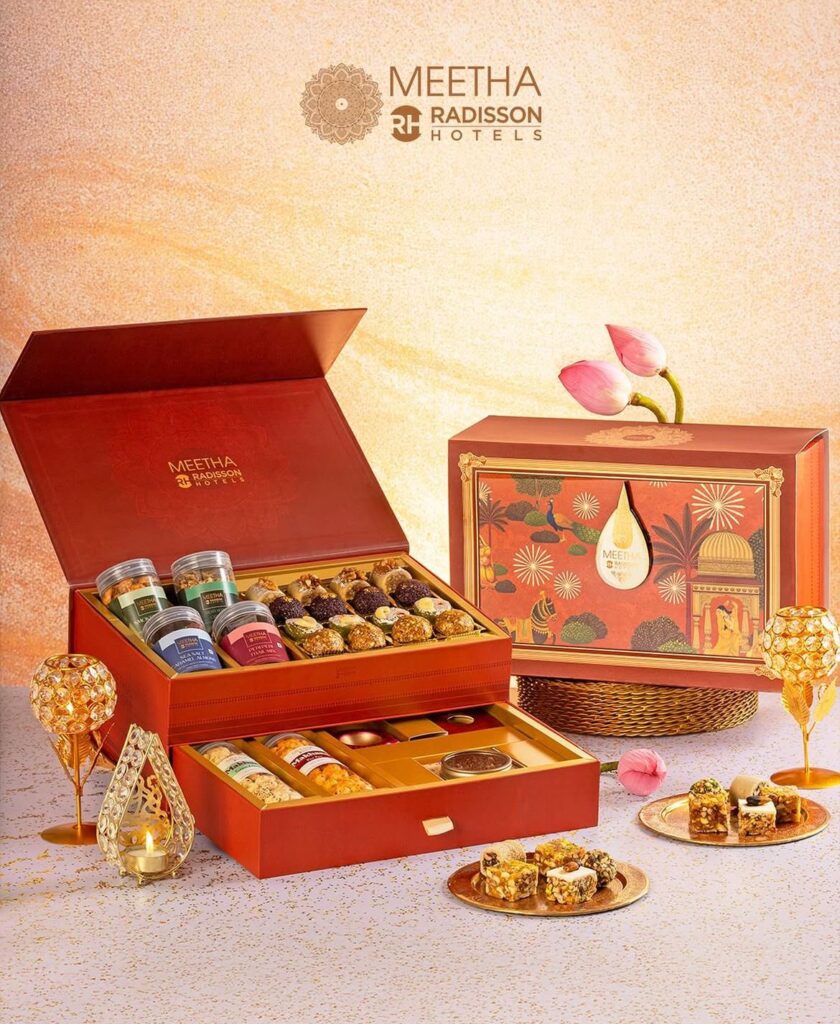 Meetha by Radisson brings the joy of indulgence with a curated selection of premium Indian sweets, dry fruits, and farsan, thoughtfully crafted to make your celebrations truly special. Highlights include signature sweets like Motichoor Ladoo, Kaju Katli, and dry fruit delicacies; chef’s creations by Chef Raghvendra Singh such as Kaju Nutella, Diamond Cake, Anjeer Cassata, Saffron Katli, Almond Katli, Walnut Roll, and Biscoff Barfi; premium dry fruits including almonds, pistachios, cashews, and raisins; and festive farsan like spicy bhujiya and Gujarati gathiya. Elegant additions such as beautifully crafted diyas complete the festive experience. Diwali hampers start at ₹3,500 + taxes, elegantly packaged and perfect for gifting.