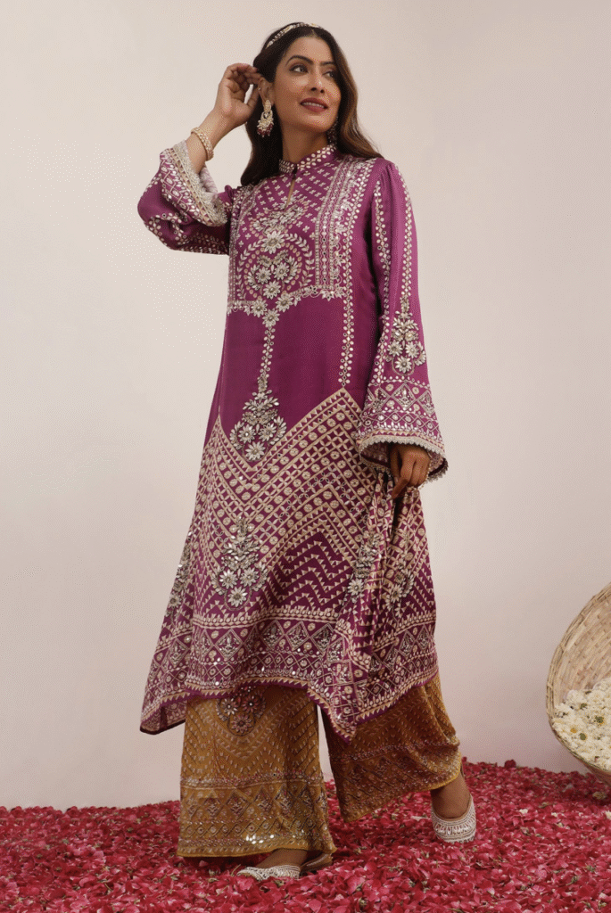 Celebrate the festive season in effortless elegance with gifting picks from Aza Fashions. For women, the Purple Cotton-Silk Gul Print Kurta Palazzo Set comes complete with mirror detailing, flared sleeves, an asymmetrical hemline, and a matching potli bag — a vibrant ensemble perfect for Diwali soirées or pre-wedding celebrations. For men, the Black Silk Resham-Embroidered Kurta Set offers timeless sophistication with its refined neckline detailing and sleek silhouette, making it an ideal choice for everything from puja gatherings to evening festivities.