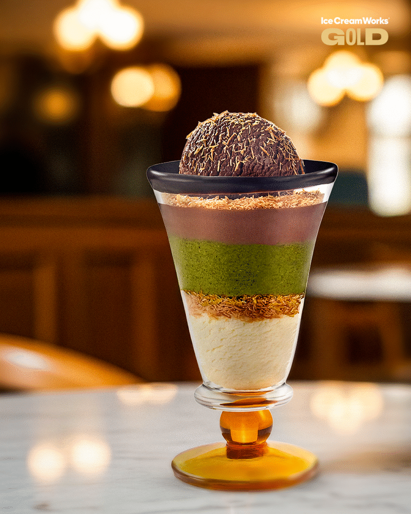 Gold by ICW unveils the Dubai Pistachio Chocolate Kunafa, an indulgent creation combining creamy Vanilla For Kings and Chewy Gooey Chocolate ice creams with a crunchy pistachio-laced kunafa, finished with rich Belgian chocolate sauce. Every bite delivers a luxurious mix of creamy, nutty, and decadent textures.