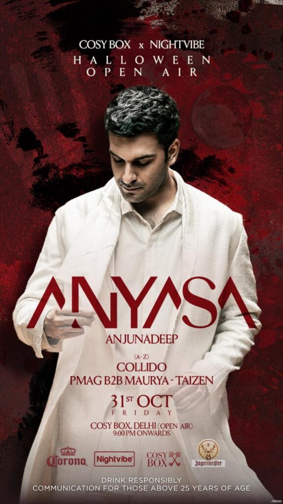 Cosy Box Delhi transforms into a gothic paradise for an electrifying night of music, mystery, and madness. On Friday, 31st October 2025, the venue comes alive with headliner Anyasa, joined by Collido, Pmag B2B Maurya, and Taizin, spinning deep melodic house and techno beats.