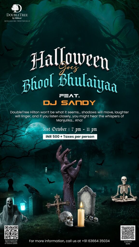 DoubleTree by Hilton, Whitefield brings a spooky twist to Bollywood with Bhool Bhulaiyaa: A Bollywood Halloween Night. On 31st October 2025, from 6:30 PM to 11:30 PM, guests can enjoy Halloween-themed food, pumpkin-inspired dishes, and “bloody” cocktails while dancing to DJ Sandy’s exclusive Bollywood beats. The evening features a fun costume contest, a photo booth, face painting, and engaging activities, making it a perfect mix of thrill, music, and festive fun.