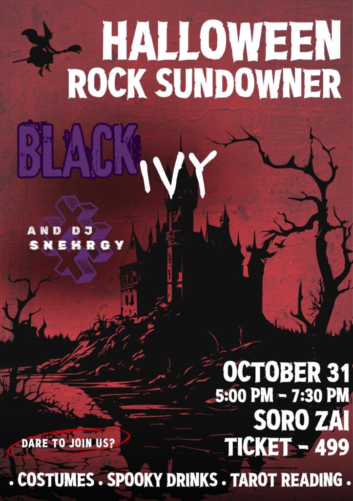 This Halloween, get ready to turn up the volume and let your dark side groove! Join us for a spine-tingling rock sundowner featuring Black Ivy and DJ SnehRgy, bringing the perfect mix of live rock and eerie energy.