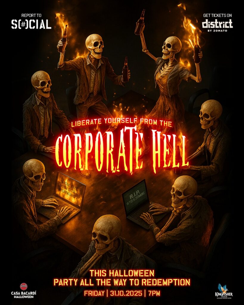 SOCIAL turns workplace burnout into a darkly hilarious celebration with Escape from Corporate Hell, a nationwide party across 45+ outlets. Step into a haunted office where tombstones mark missed deadlines, skeletons haunt unpaid overtime, and the only KPI is how hard you dance. The night features a limited-edition cocktail menu CTRL + ALT + BOO with cheeky drinks like Error 404: Soul Not Found and Last Intern Standing, alongside special beer bucket offers. Each outlet transforms into a twisted workplace satire — complete with cubicle graveyards, “missing employee” posters, and tombstones of office horrors. Expect high-energy sets from top DJs across Mumbai, Delhi NCR, Bengaluru, Pune, Hyderabad, Chandigarh, Kolkata, Dehradun, and Lucknow. Because this Halloween, at SOCIAL, burnout becomes the party.