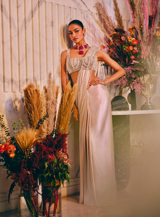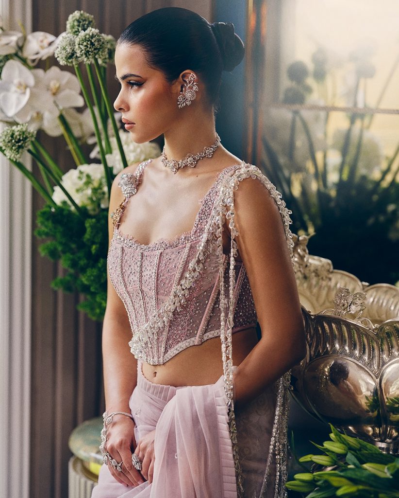 Every detail, from a light crystal drape to a sculptural blouse framing the waist, is intentional. “Embroidery tells its own story. Inaya is about capturing the essence of the modern Indian bride and groom—rooted in heritage, yet full of today.”