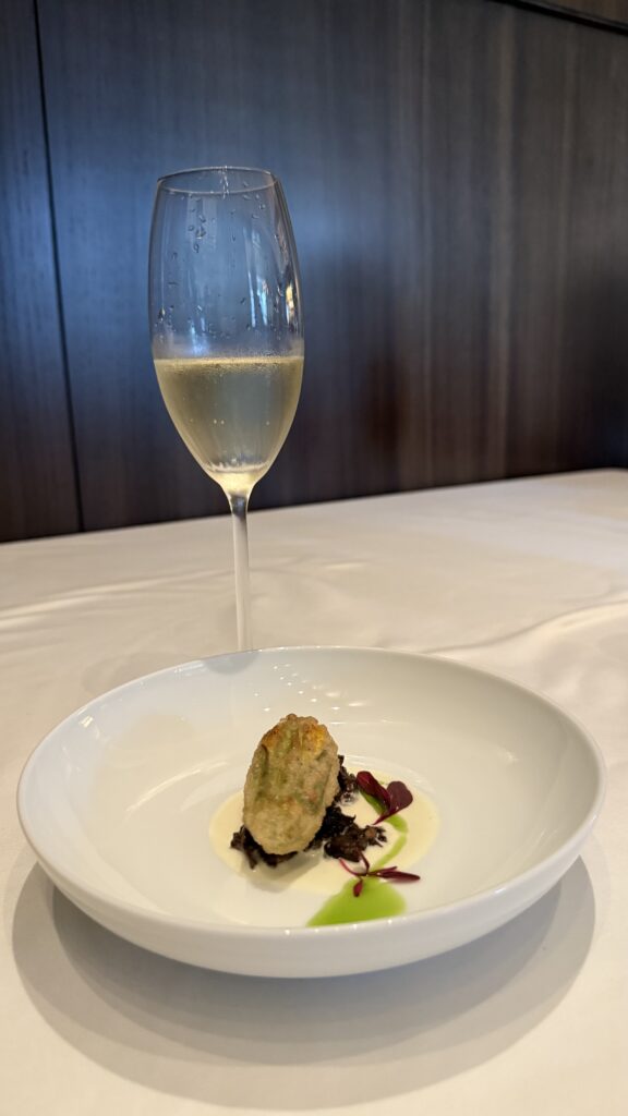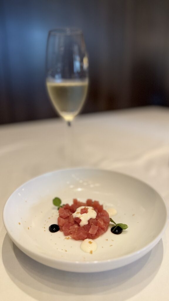 and sea beautifully in its cuisine. My journey as a chef has always been about respecting simplicity and letting ingredients shine. I picked tuna tartare and zucchini flowers as they are classics that bring together the freshness of the sea and the richness of Ligurian gardens,” he explains. The first course was paired with the light and refreshing Luna Argenta Prosecco.