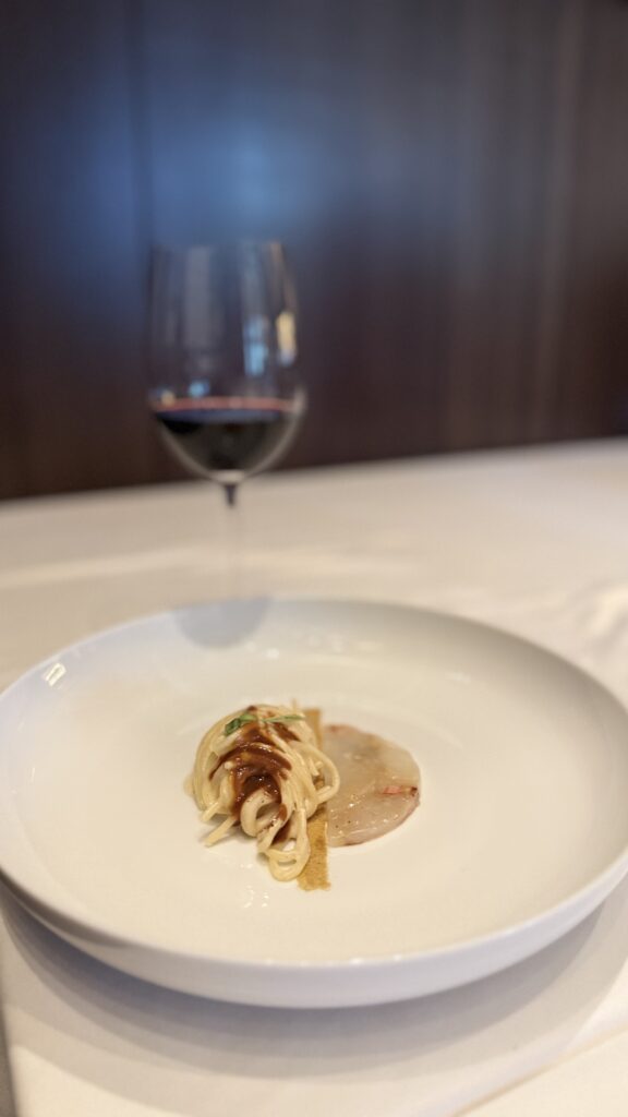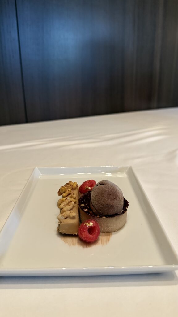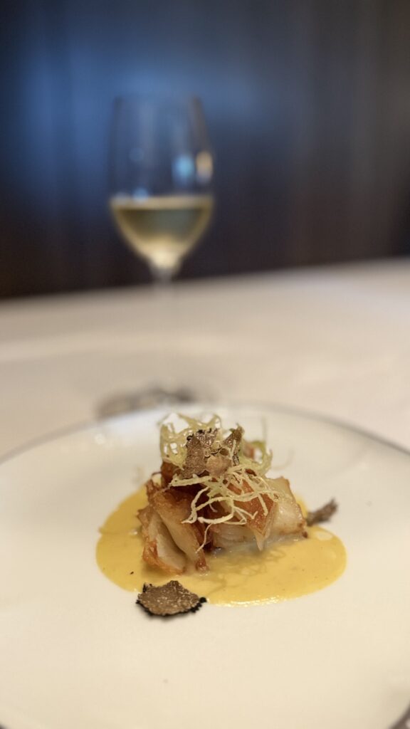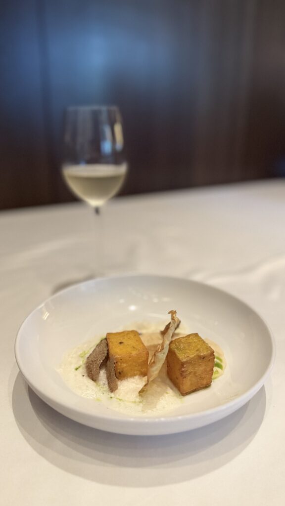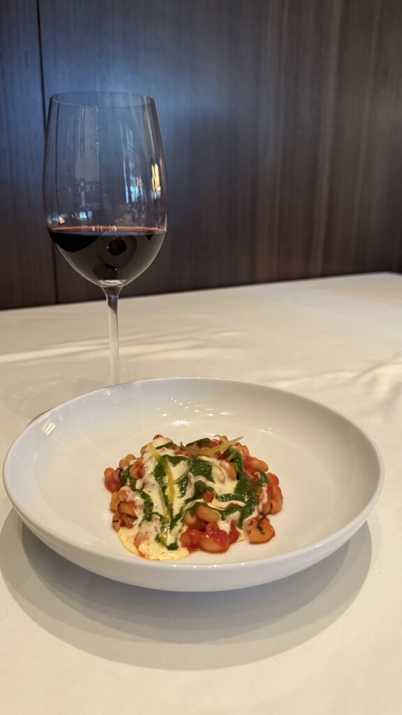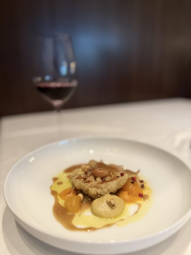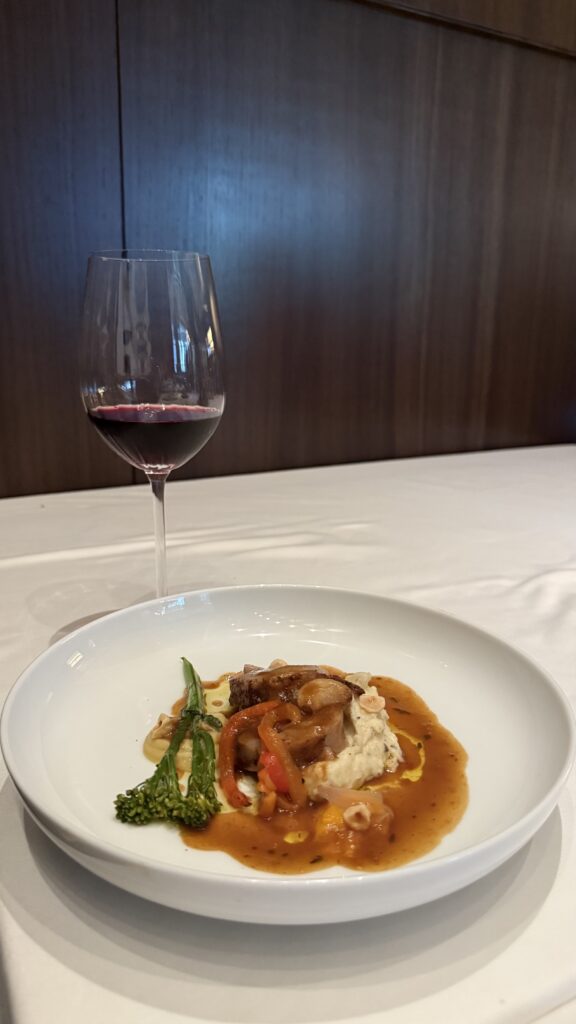 Showcasing Abruzzo’s soulful and rustic cuisine, chef Domenico Cicchetti offered a choice between roasted cauliflower or lamb saddle, served with leeks, chickpeas and garlic mash, along with baked shallots, hazelnut, and thyme onion or thyme lamb sauce. “My journey has been about staying true to traditions while refining them for modern dining, and these dishes with our kitchen staples like chickpeas, lamb, and shallots represent both the humble and celebratory sides of Abruzzese cuisine,” he says. The dish was paired with La Piuma Chianti.