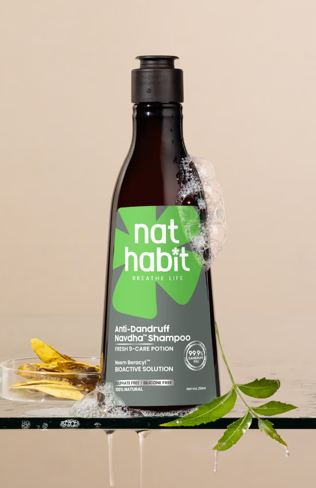 Nat Habit introduces the Fresh Navdha Anti-Dandruff Shampoo, a clinically tested formulation designed to eliminate 99.9% of dandruff-causing fungus. Powered by Advanced FlakeZero™ Technology with 5% Beracyl™, the plant-based formula targets fungal overgrowth, excess sebum, and scalp inflammation. Enriched with Neem actives, Green Tea EGCG, Bhringraj extracts, and Lactic Acid, it helps restore scalp balance while remaining sulfate and silicone-free.