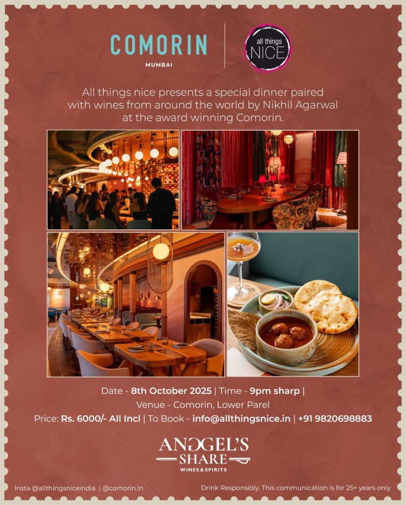 All Things Nice, in collaboration with Comorin, presents a curated wine and food pairing dinner on 8th October 2025 at 9 PM. Guests will enjoy a four-course menu blending Comorin’s inventive Indian cuisine with globally acclaimed wines curated by Nikhil Agarwal, CEO of All Things Nice. Menu highlights include Dahi Batata Puri, Smoked Kathal Galawat, Three Pepper Chicken Tikka, Comorin Dal Tadka, Champaran Mutton, Nilgiri Masala Prawns, and desserts like Cheeni Malai Toast and Comorin Cassata. Wines include Casa Bottega Prosecco, Remstal Riesling, Bordeaux Blanc, Pinot Noir, California Chardonnay, Margaret River Cabernet, and Blue Lady Cabernet Sauvignon.