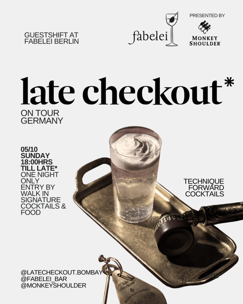 Late Checkout brings its bold, Indian-inspired cocktail program to Berlin for a one-night-only takeover at Fabelei. Following successful global showcases in New York and Singapore, this debut cements the bar’s reputation as a pioneer of Indian mixology, taking the country’s vibrant cocktail culture to an international audience.