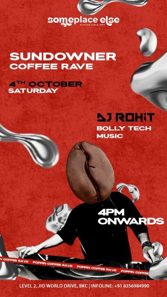 Someplace Else, Jio World Drive, Bandra Kurla Complex, Mumbai, hosts the Sundowner Coffee Rave. Expect golden hour vibes, coffee cocktails, and a house set that moves from laidback to lit. Smooth sips, upbeat sounds, and the perfect blend of caffeine and celebration make it the ideal pre-game or chill weekend wind-down.