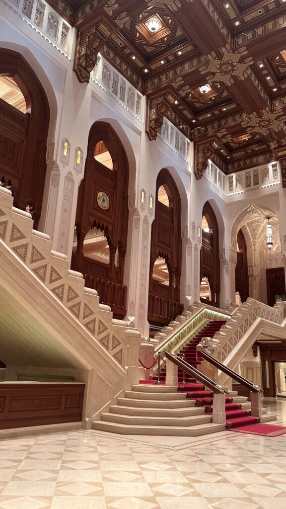 During the day, like us, get a taste of Muscat’s cultural and architectural wonders at the Royal Opera House and Sultan Qaboos Grand Mosque. Merging Omani and contemporary style of architecture, the opera house stands as a symbol of traditional-meets-modern design, where local Omani talent as well as global performers share the stage. When here, don’t miss the guided tour that takes you behind the scenes of all the action, showcasing the venue’s technical prowess and its decorative artistry. Not only did we see its collection of rare instruments, but also observed its interiors showcasing Mughal, Islamic, Oriental and European motifs. The grand staircase with a red carpet made for a royal photo spot.