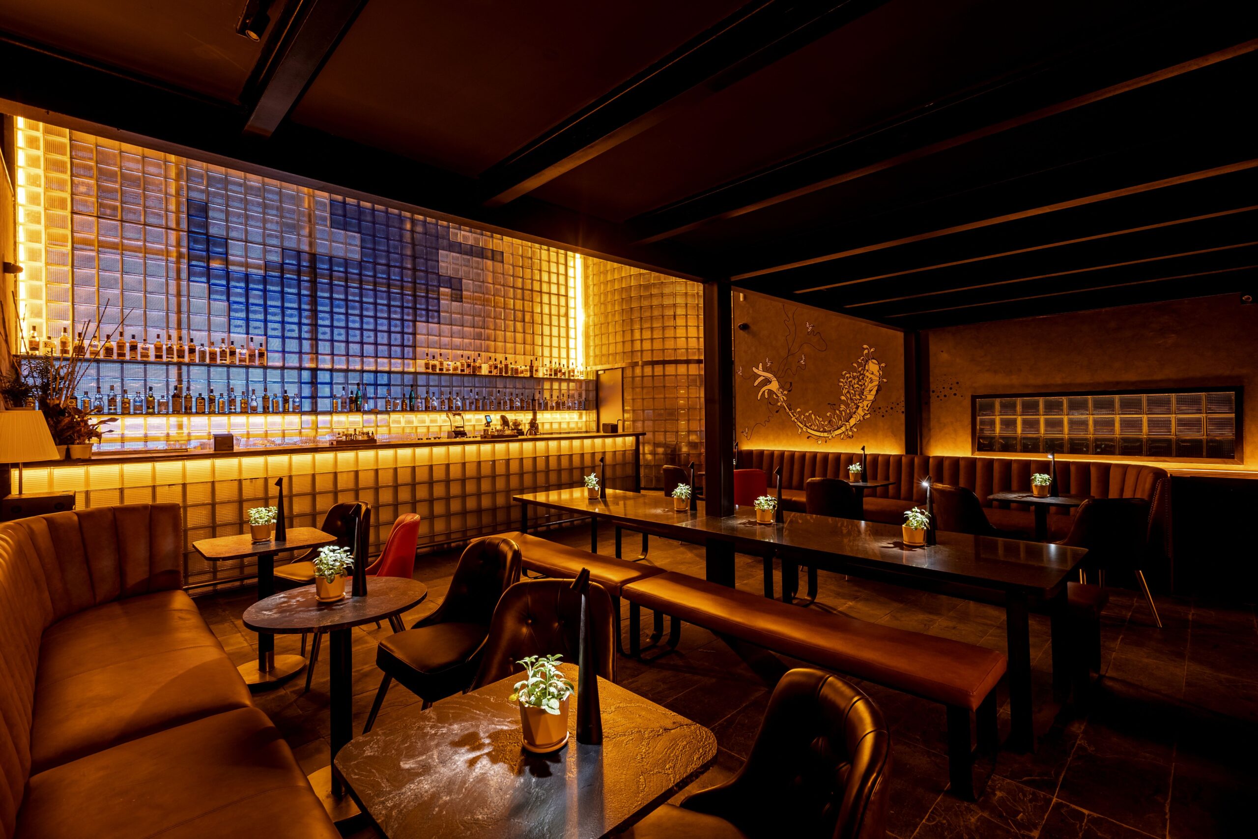 The space unfolds like a theatre rather than a nightlife venue. Lighting is deliberately dim and directional, guiding attention instead of demanding it. Sound, movement, and service are choreographed with precision, creating a rhythm that encourages conversation and quiet discovery. At the centre stands a striking double-height bar that visually connects both floors, functioning as a shifting stage rather than a static counter. Behind it, a dramatic translucent wall plays with the idea of illusion, abstract and unreadable to the naked eye, yet revealing itself only through a phone screen. It’s a thoughtful inversion of how we consume the world today, subtly questioning where our attention truly lies.