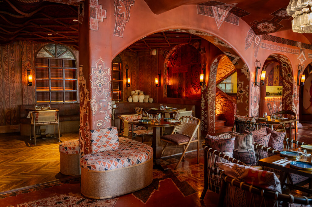Before anything hits the table, the space already does half the talking. The interiors feel layered and thoughtful without trying too hard. There are earthy terracotta tones everywhere, broken up with hand-painted details, woven textures, and warm wood. Arched doorways gently divide the dining area, making the space feel intimate rather than sprawling. The lighting is soft and low, casting a glow that feels comforting and almost familiar, not dramatic, not staged, just right.