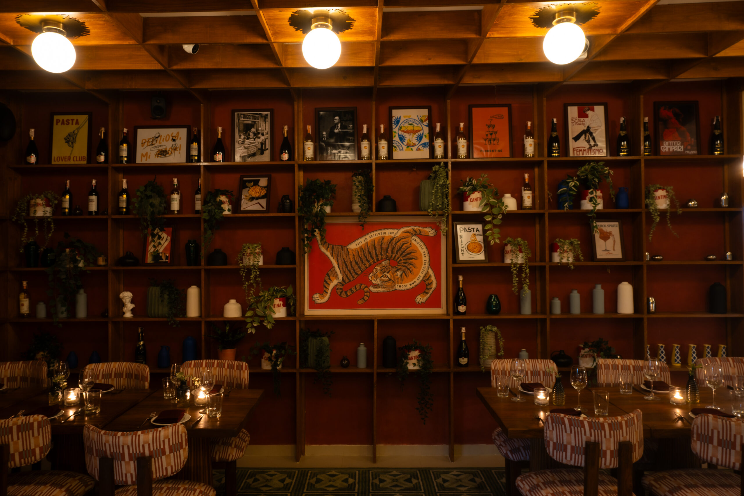 At Cantina — which stands where Nho Saigon once stood — the vibes are warm, the music is bopping, and the food slaps. In its decor (by Ruchi Jani), rusty, burnt-tomato tones, mustard walls, wooden finishes, and artworks on the walls all fuse into a playful nod to what they serve. The booth bar occupies a good chunk of the room. There is also an oven and a prep station in the far right, where you can see your pizza turn into golden pies. The wooden wall showcases vinos, vases, plants, food artworks, and more. But at the centre of it all, binding the whole thing together, is an illustrated tiger in a flexible yogic pose with a quote by Chinese philosopher Lao Tzu that reads: Those who are flexible and yielding are disciples of life.