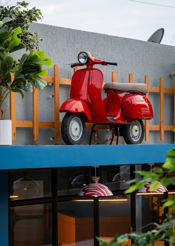 The entrance sets the tone: a vintage Sony television reflecting your face like a soft nostalgia filter. It’s playful, almost childlike, and not screaming for social media attention. The diner opens into red-blue palettes, retro warmth, and slight whimsy, a Vespa installation on the terrace, oversized coffee mugs, textured finishes, and light that doesn’t try too hard to spotlight you. Instead, it highlights the open kitchen, where dough is stretched, sauced, and charred and the quiet theatre that reminds you why you’re here.