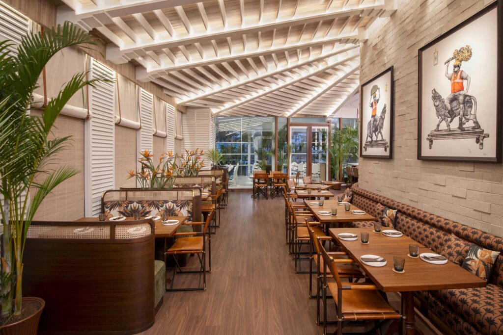 A blue-and-white façade welcomes one to the restaurant, which has opened at One Horizon Centre – the same space where Comorin, another venture by EVH International, is located. The colour theme continues into the patio area, where white rattan chairs with blue upholstery sit under tall palms that add a calming touch of green.