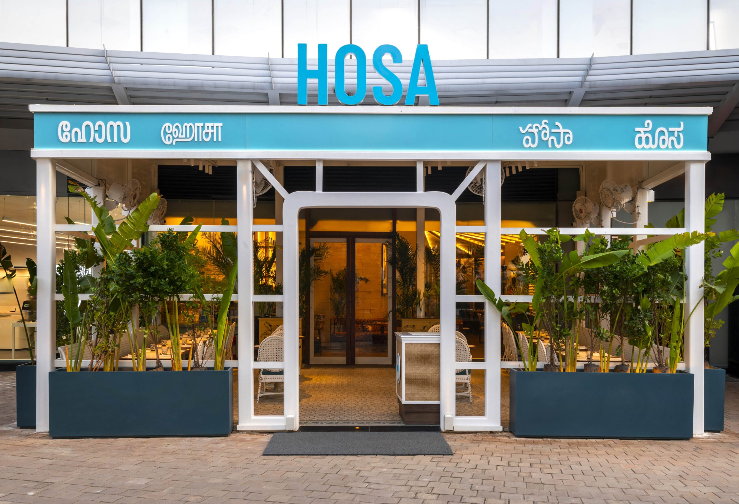 A blue-and-white façade welcomes one to the restaurant, which has opened at One Horizon Centre – the same space where Comorin, another venture by EVH International, is located. The colour theme continues into the patio area, where white rattan chairs with blue upholstery sit under tall palms that add a calming touch of green.