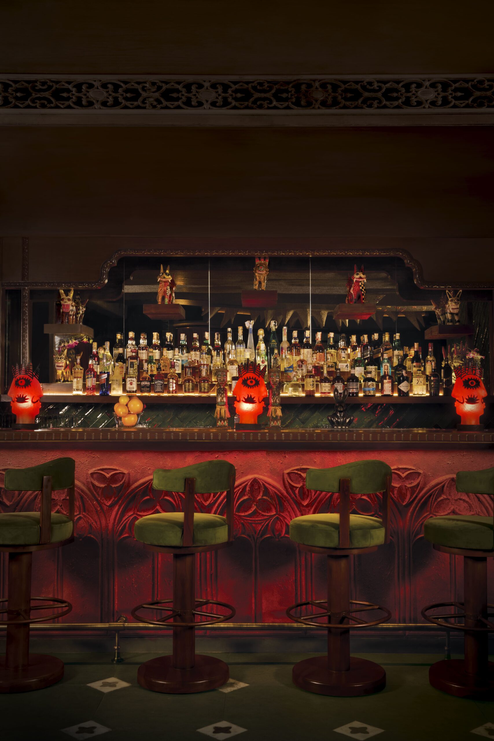 Designed by Sumessh Menon, the interiors immediately disarm with their drama. Crimson walls play against deep teals, creating a palette that is bold yet intimate. Handmade ceramic chandeliers cascade light in sculptural forms, while the glowing Agave Lamp, suspended overhead, anchors the room with theatrical brilliance. The playful Paloma Cats peek out across ceilings and corners, and glowing artifacts shimmer softly, drawing your eye to unexpected details. The entrance itself feels like a stage the rotating Paloma Man stands tall, part art piece, part emblem, hinting at the creative spirit that runs through the space. Art by Siddharth Kerkar stretches across the walls, bold and evocative, transforming the bar into something that exists as much for discovery as it does for conversation. It is tactile, layered, and warm, a design that never feels sterile despite its polish.