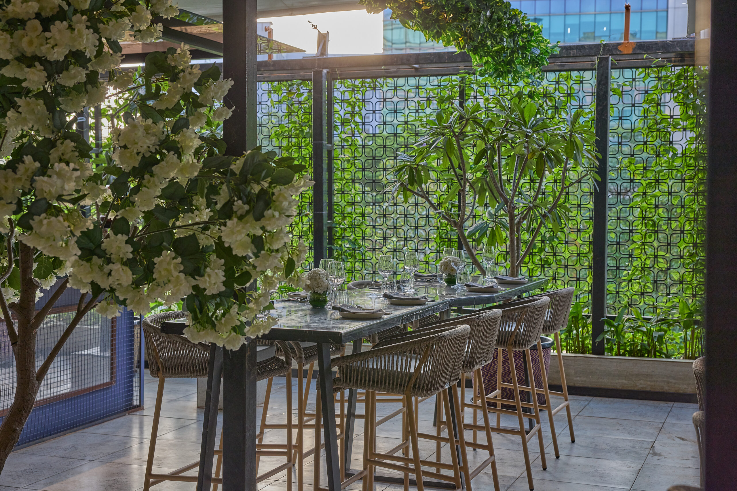 It’s a cheerful concert of paintings on the walls. Limy green in Instagrammable corners, with lines of crows perched in artworks to tessellating butterflies to Mona Lisa with cheeky bubblegum pops to handstroked flowers, setting the mood for the natural light that spills in the background into the outdoor area cupped with pegged plant trellis. The skilful placement of mirrors, full length glass windows and happy hues lines the expansive run – lending a visual fluidity to the entire space.