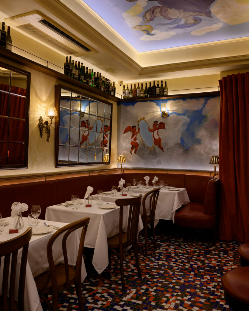The 1,000 sq. ft. space, designed by Patch Design Studio, features hand-laid mosaic floors, deep maroon banquettes, and a zinc bar. American artist Kacper Abolik (the restaurant’s namesake) spent a month in Mumbai painting cherub frescoes by hand throughout the space. The dining room accommodates 35 covers, with an additional 5 seats at the bar. Behind a red velvet curtain, the Yves Klein Blue bathroom includes a Thomas Crapper WC and its own playlist.