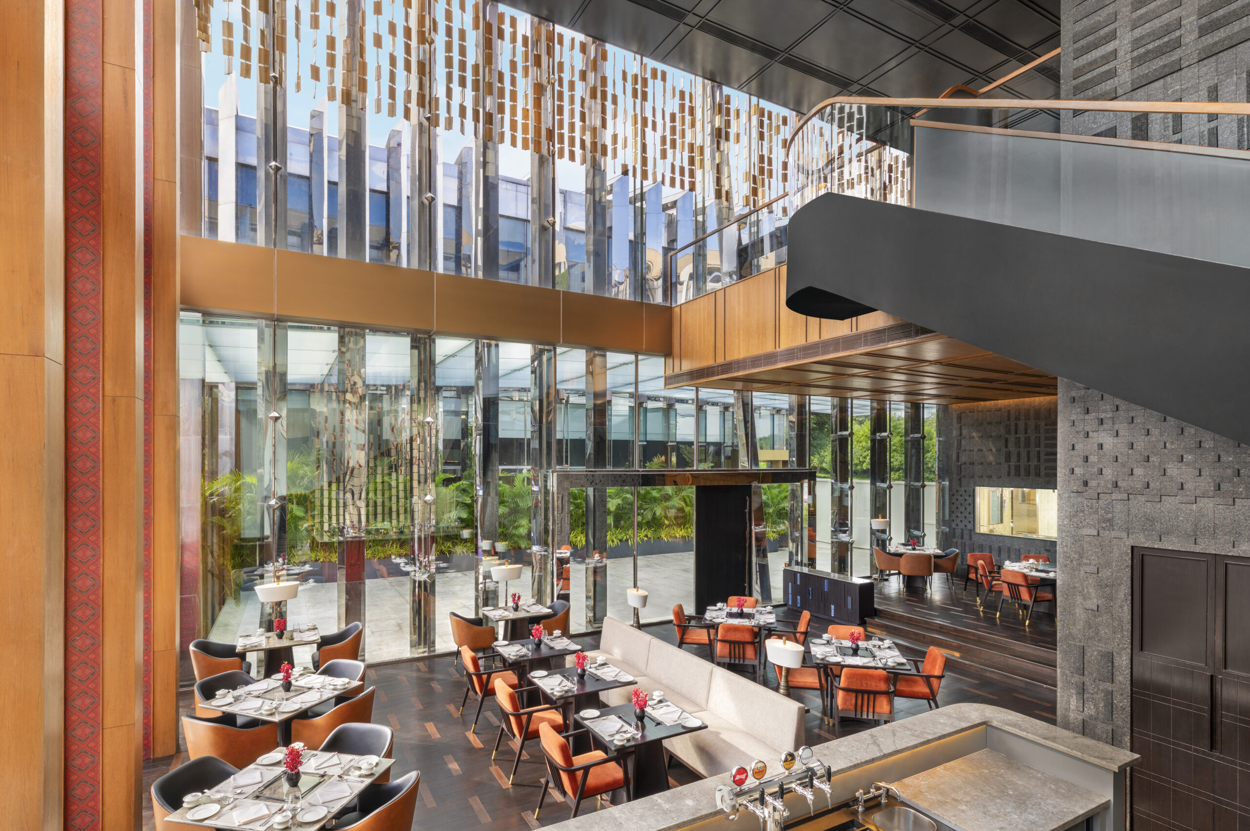 The bright and airy upscale restaurant is housed in a glass pavilion that overlooks the hotel’s signature blue reflective pool. The pitter patter of rain only adds to the charm of this 86-seater space spread over two levels but I can imagine returning on a winter day to watch sunlight shimmering on the glass. The suspended ceramic tiles, wood and stone interiors all create an elegant space. A private dining room for 12 people on the upper level is the right spot for small gatherings.