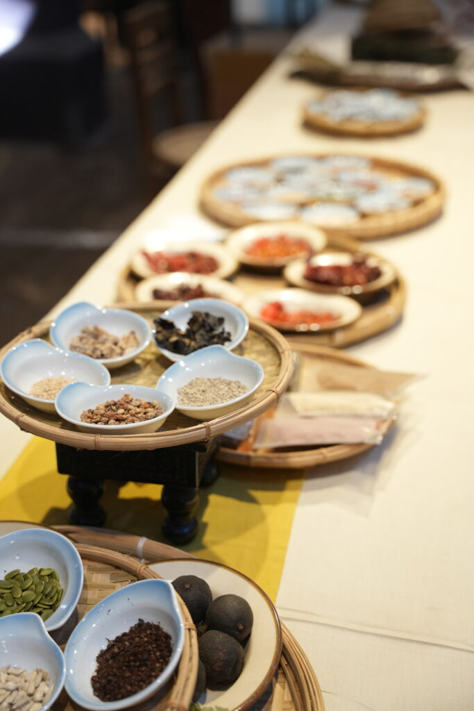 A cavernous warehouse space is hung with striking portraits of the Kachin people, an ethnic group that inhabits Northern Myanmar, Northeast India, and Yunnan, China. The ambient Tibetan music, the black-and-red table setting, and the five-course meal take you on a journey through the borderlands where food is both anthropology and art. ‘Highland Crossroads’ sees Chef Bawmra Jap of Bomras Goa and renowned photographer Pablo Bartholomew trace their respective Burmese ancestry in a one-of-a-kind collaboration. “It’s my take on the way we cook using bamboo and banana leaves, steaming, grilling, or smoking,” says Chef Bawmra. Case in point is the Singh Po-style chicken cooked in bamboo leaves and served with the pungent axone sauce, or the melt-in-your-mouth banana leaf-wrapped river fish with fiddlehead fern and machinga leaf — all complemented by a looped slideshow of Bartholomew’s stunning photos across the countryside and markets of Myanmar and Northeast India.