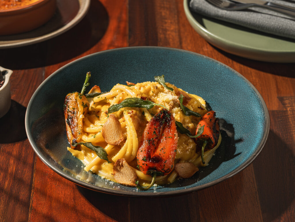 “Carbonara” trades pancetta for roasted baby peppers, capers, and sage, giving the classic Roman dish a bright, smoky soul. It’s creamy without cream, indulgent without excess, and proves that comfort doesn’t always need bacon to have bite.