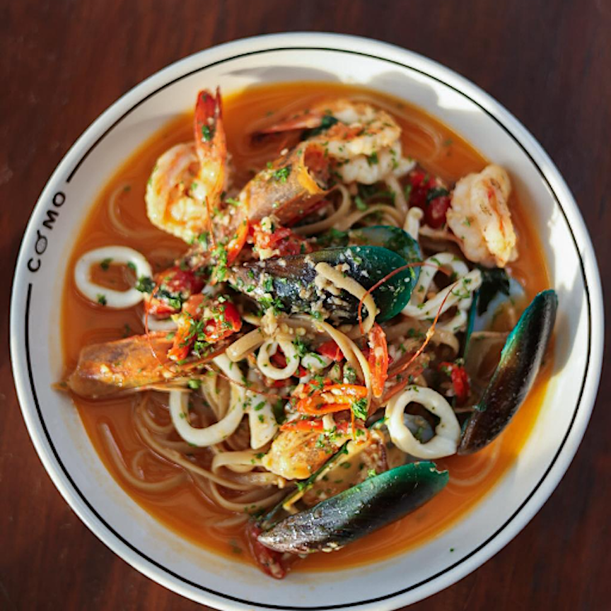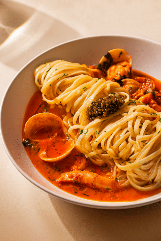 A celebration of coastal flavours, this pasta brings together prawns, octopus, clams, crabmeat, and squid—each cooked separately to preserve its unique taste and texture—tossed in a rich, briny sauce that’s layered, bright, and unexpectedly clean. Moving away from the usual one-note seafood pasta, every element stands on its own, giving each bite a new flavour experience. Light, precise, and indulgent (top it with a dollop of caviar if you wish), it’s the pure taste of the ocean on a plate.